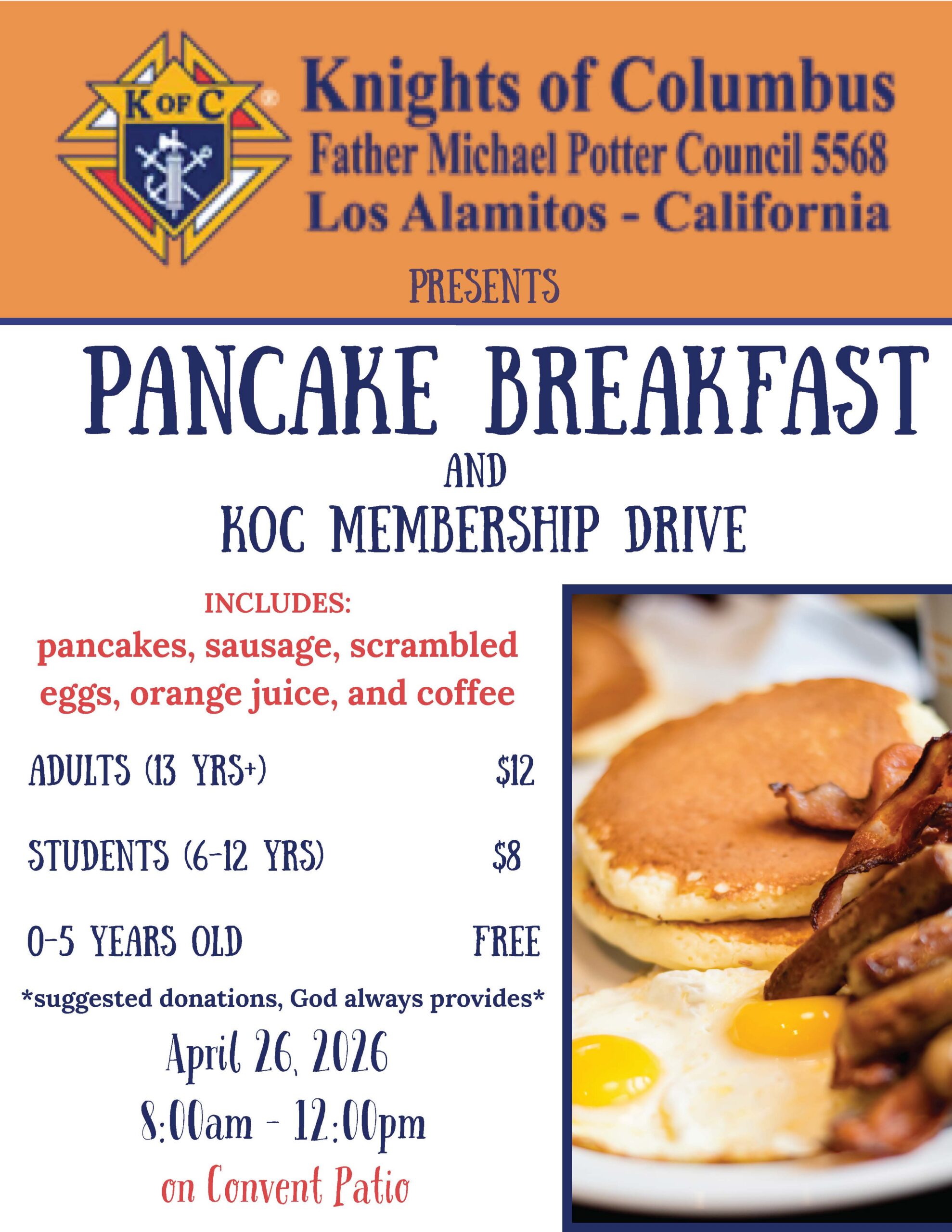 Please join the Knights for a delicious pancake breakfast on Sunday, April 26 on the Parish Center Patio (former Convent) across from Quinn Hall.