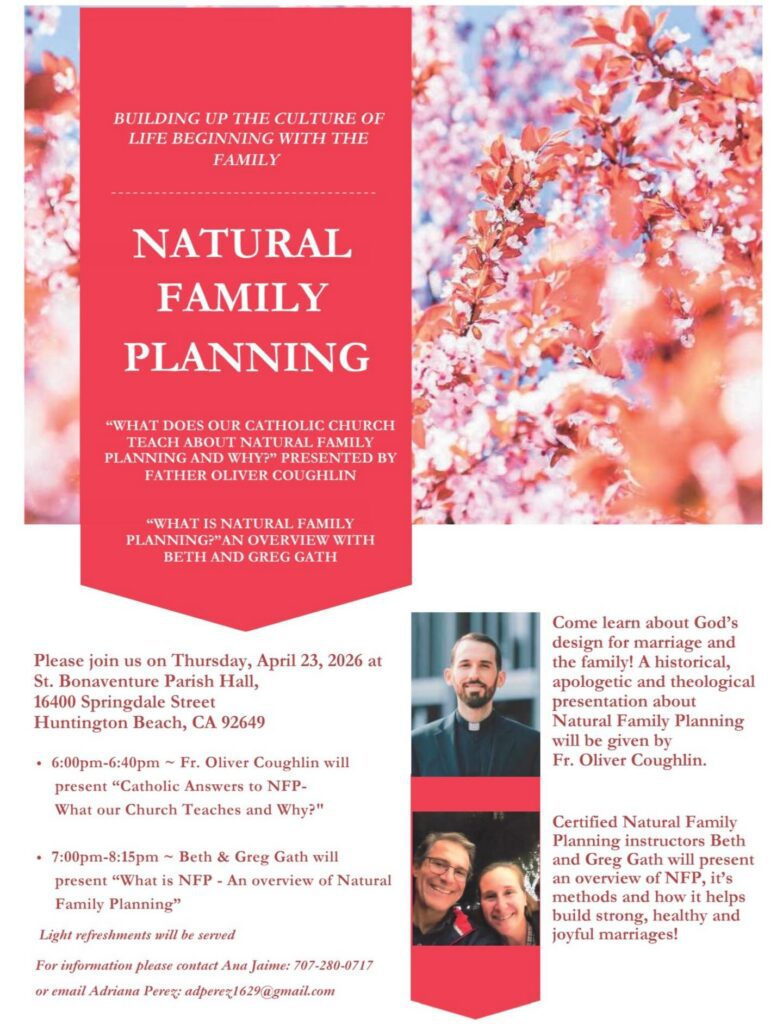 Come learn about God’s design for marriage and the family at a Natural Family Planning talk given by Fr. Oliver Coughlin, who will present “What our Catholic Church teaches about NFP and Why?” Couple to Couple League certified instructors Beth & Greg Gath will present “An Overview of NFP, its methods and how it helps build strong, healthy & joyful marriages that are open to life!”