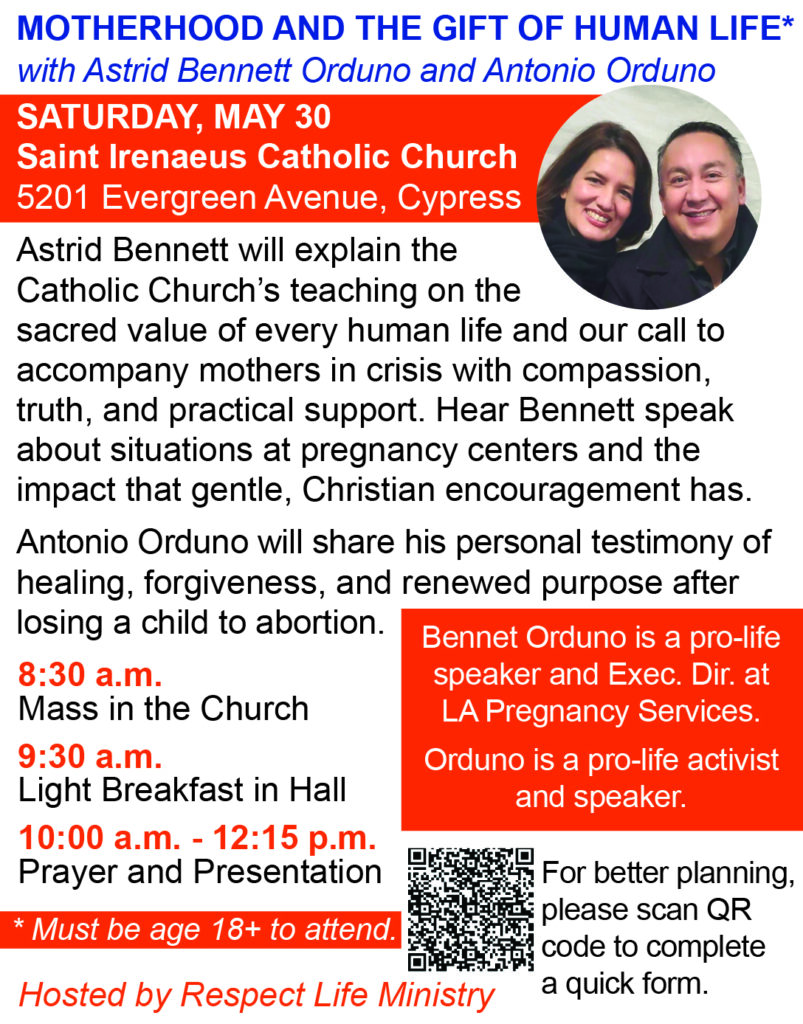 Each evening will take place at a different location: May 8 will be at St. Kilian in Mission Viejo, May 11 will be at Christ Cathedral in Garden Grove, and May 15 will be at Our Lady of Guadalupe in La Habra.