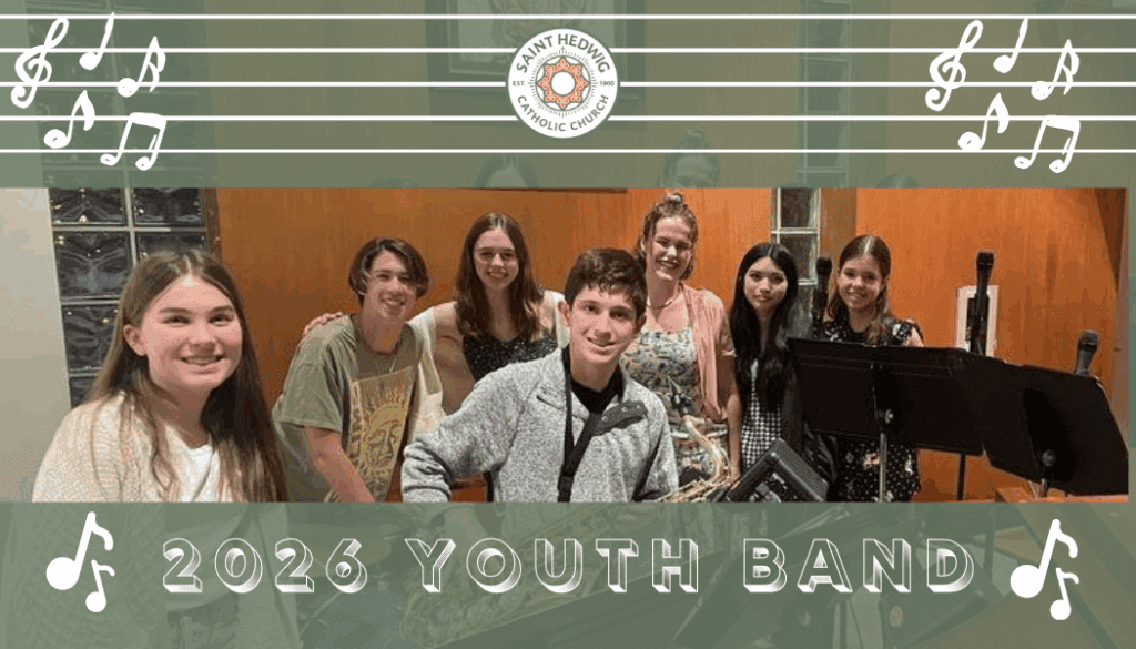 High school–aged students with musical talent are invited to serve in our Youth Band! The Youth Band serves once a month at the 5:00 PM Sunday Mass, beginning Sunday, January 18, with rehearsal starting at 3:00 PM the same day.
